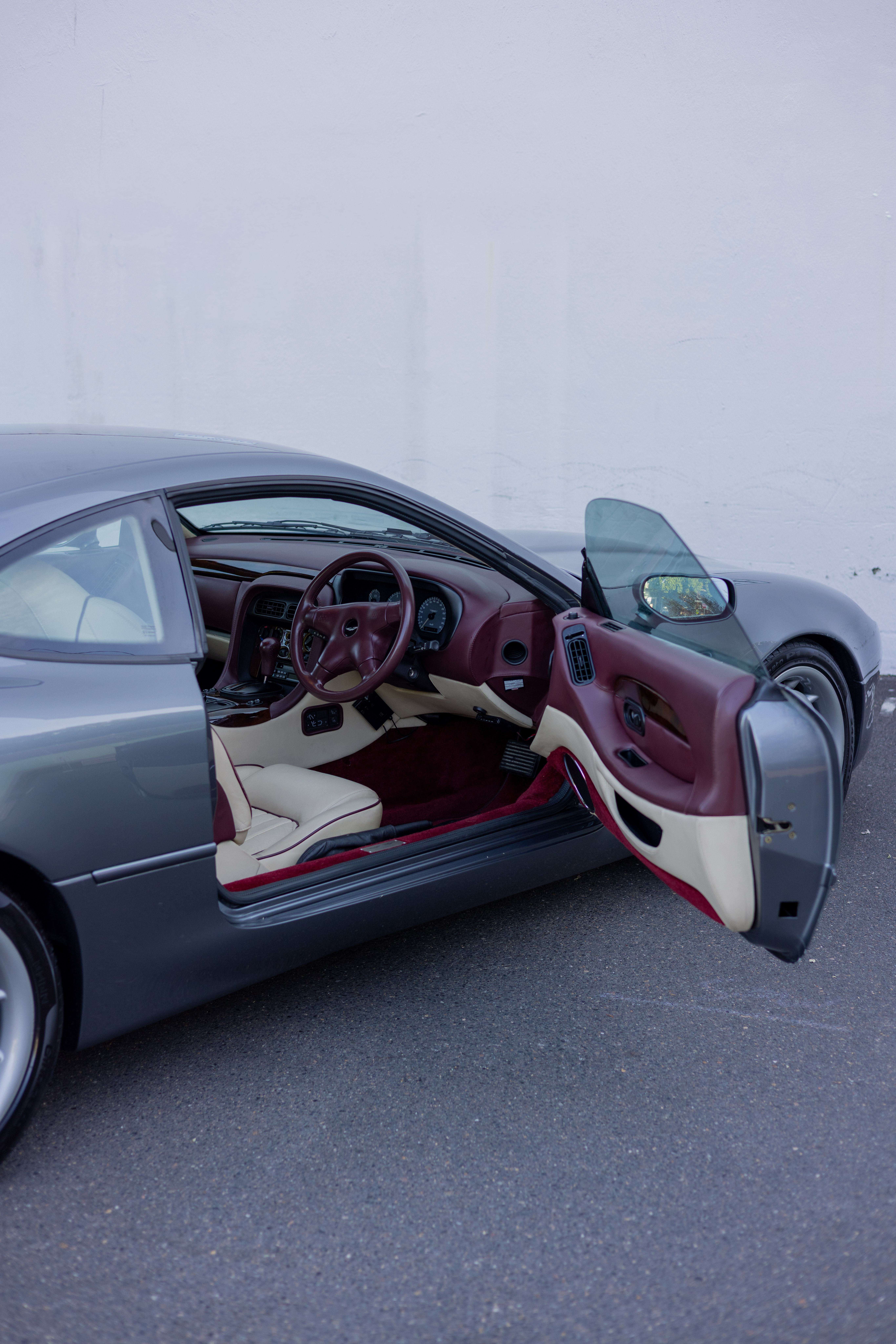 This DB7 special ordered interior features contrasting oxblood leather piping on parchment leather seats, a parchment Alcantara suede headlining, oxblood carpets, high-gloss burr-walnut veneer inlays, and electronically adjustable and heated seats.